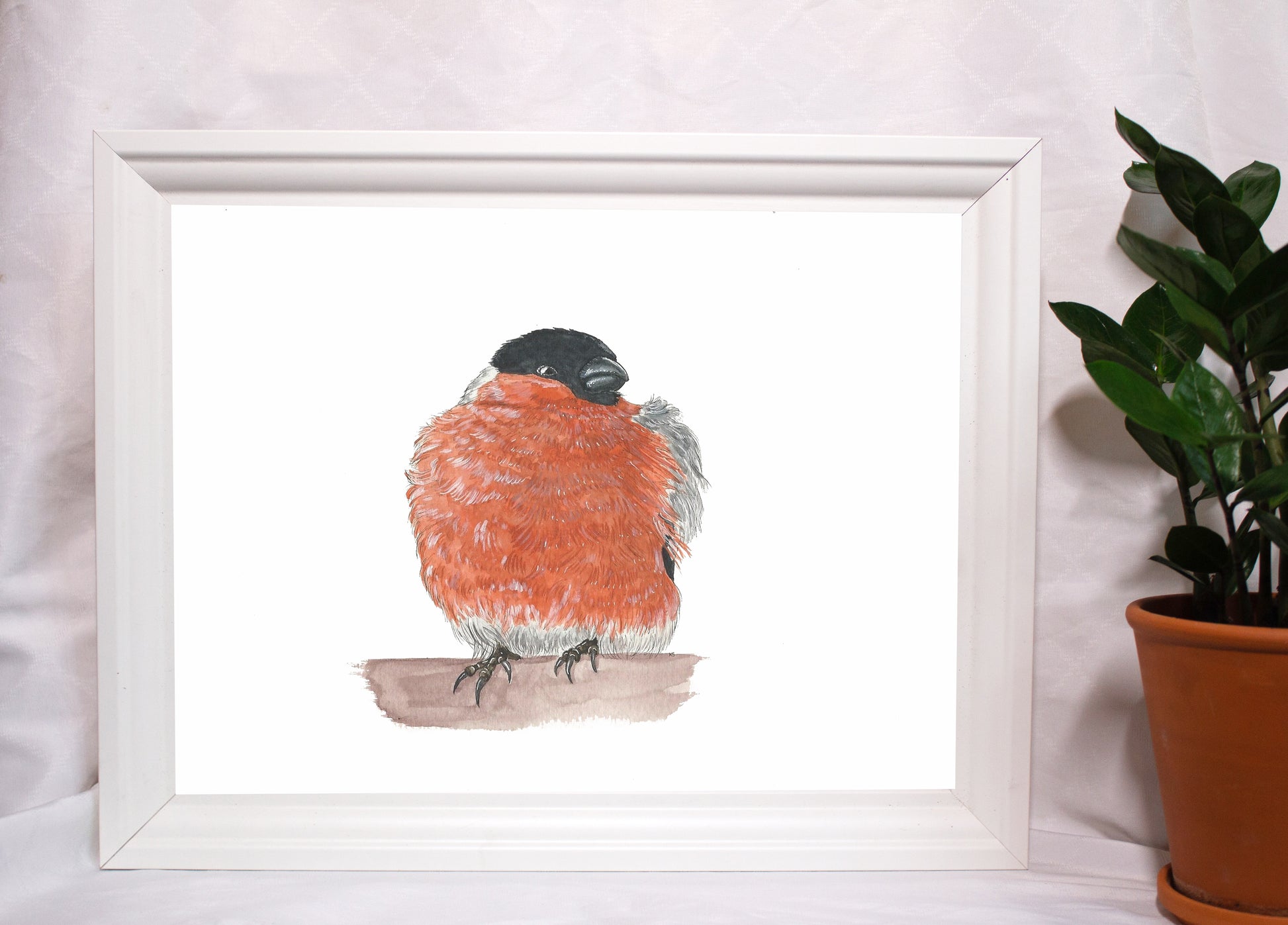 Schöner Kunstdruck auf hochwertigem Papier. Motiv ist ein Aquarell eines männlichen Gimpels mit deren charaktarischen roten Bauchgefieder.