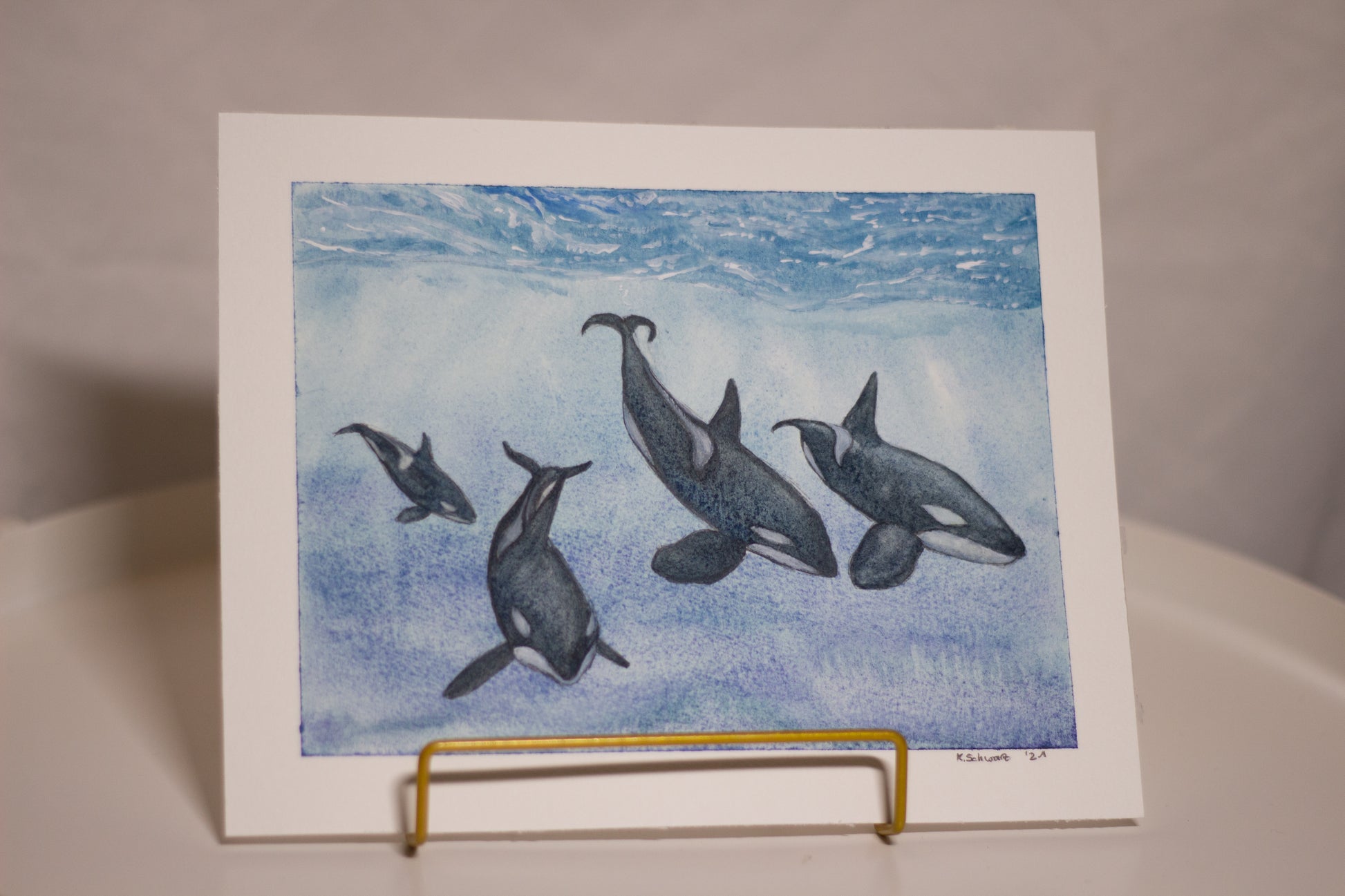 Originale Aquarellmalerei einer Orcafamilie im Wasser. Auf hochwertigem 300g/m2 Aquarellpapier von Canson Montval gemalt.