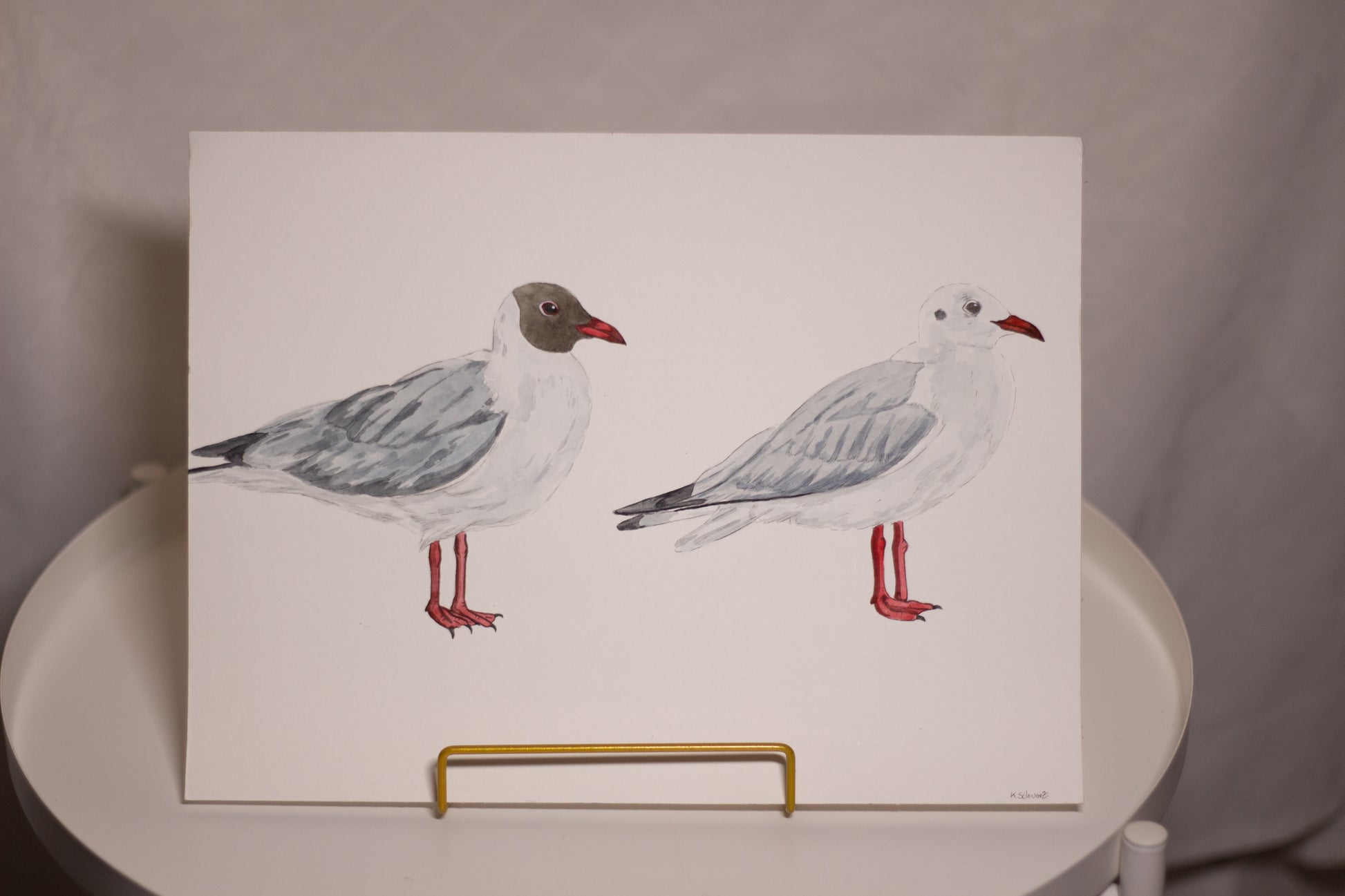 Originale Aquarellmalerei von einer Lachmöwe im Sommer- und Wintergefieder. Auf hochwertigem 300g/m2 Aquarellpapier von Canson Montval gemalt.