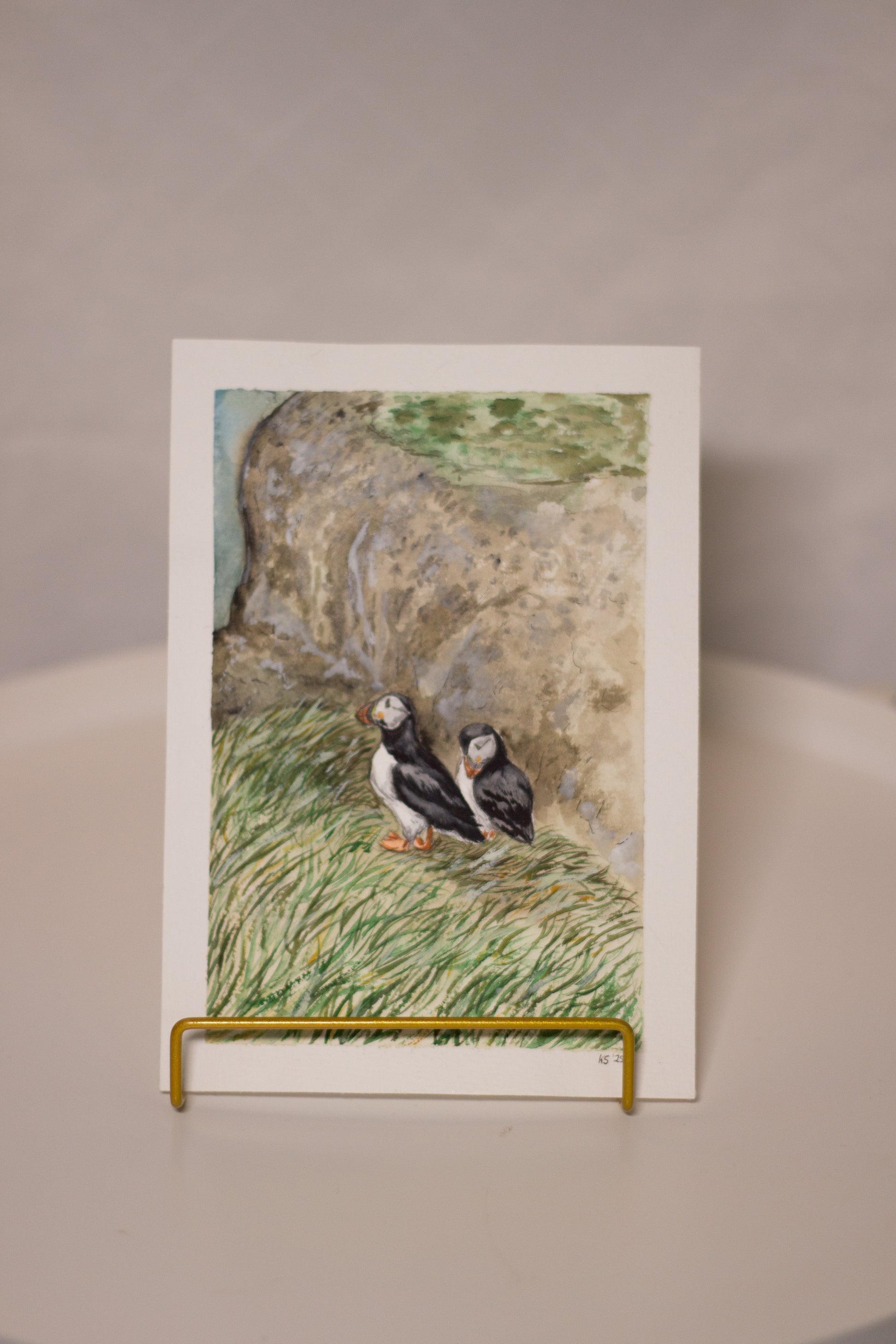 Originale Aquarellmalerei einer schottischen Küstenlandschaft im Sommer mit Papageientauchern. Auf hochwertigem 300g/m2 Aquarellpapier von Canson Montval gemalt.