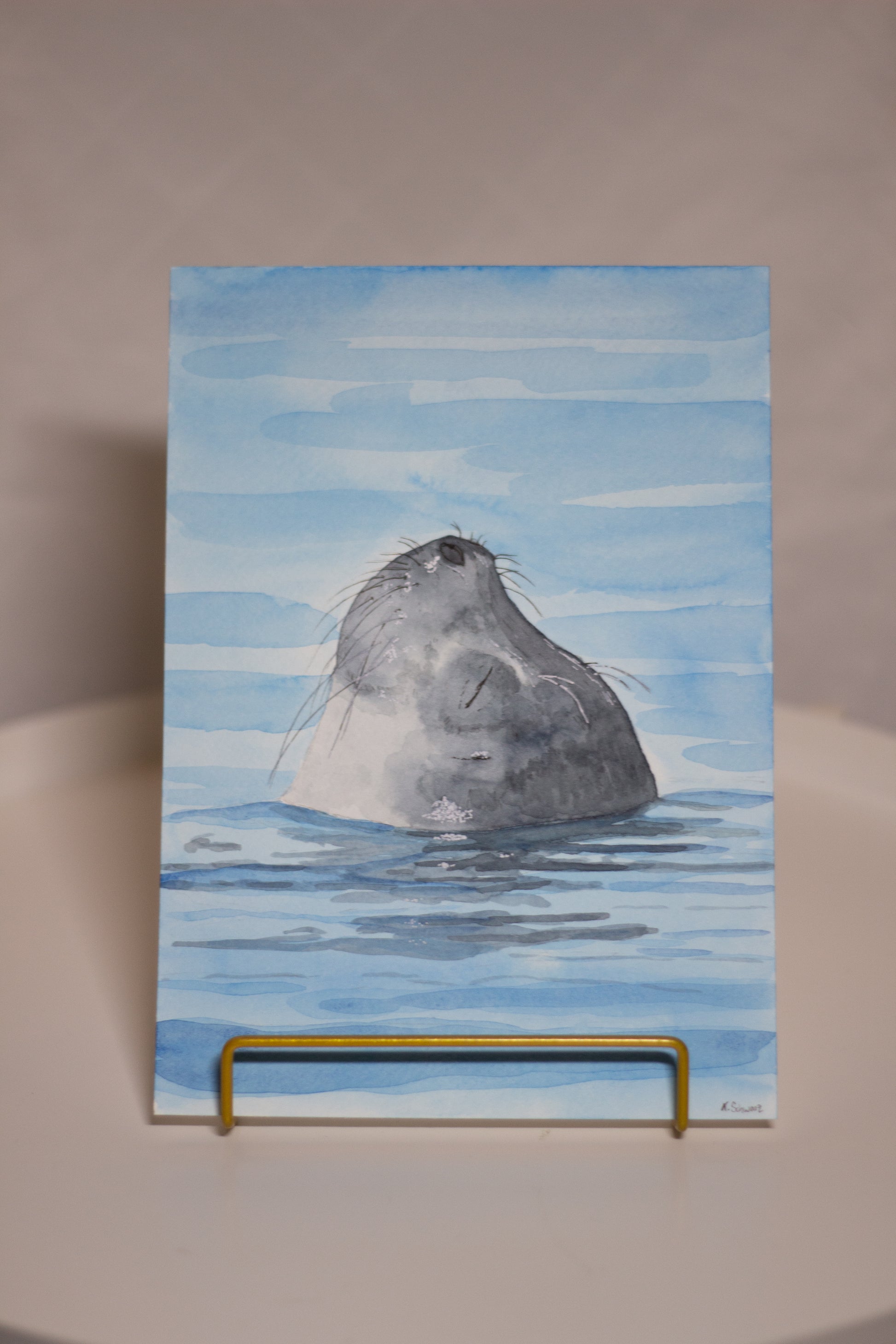 Originale Aquarellmalerei einer Robbe die aus dem Wasser blickt. Auf hochwertigem 300g/m2 Aquarellpapier von Canson Montval gemalt.