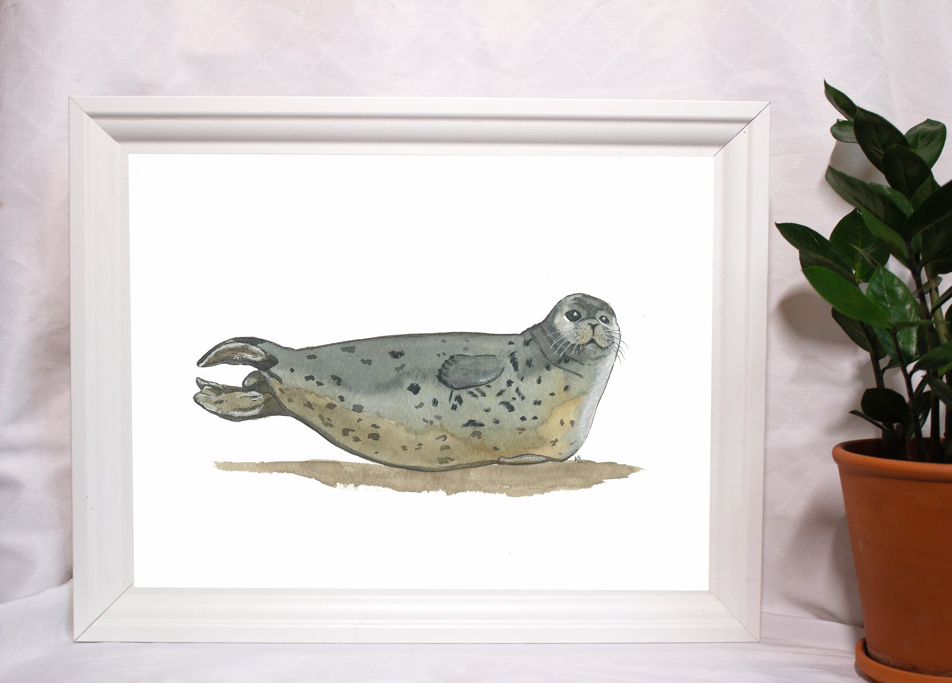 Schöner Kunstdruck auf hochwertigem Papier. Motiv ist ein Aquarell einer liegenden Robbe.