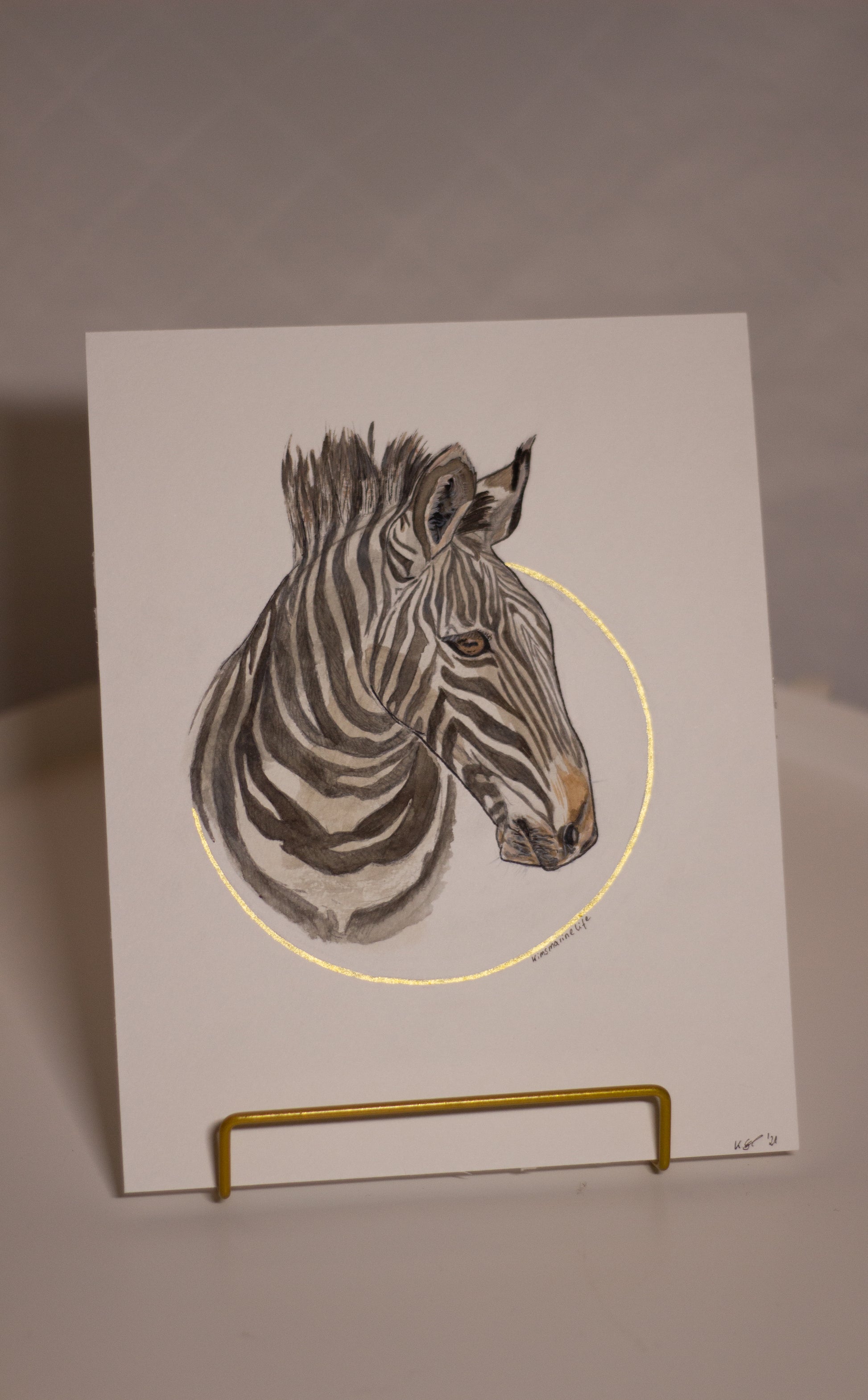 Originale Aquarellmalerei eines Zebras mit Goldverzierung. Auf hochwertigem 300g/m2 Aquarellpapier von Canson Montval gemalt.